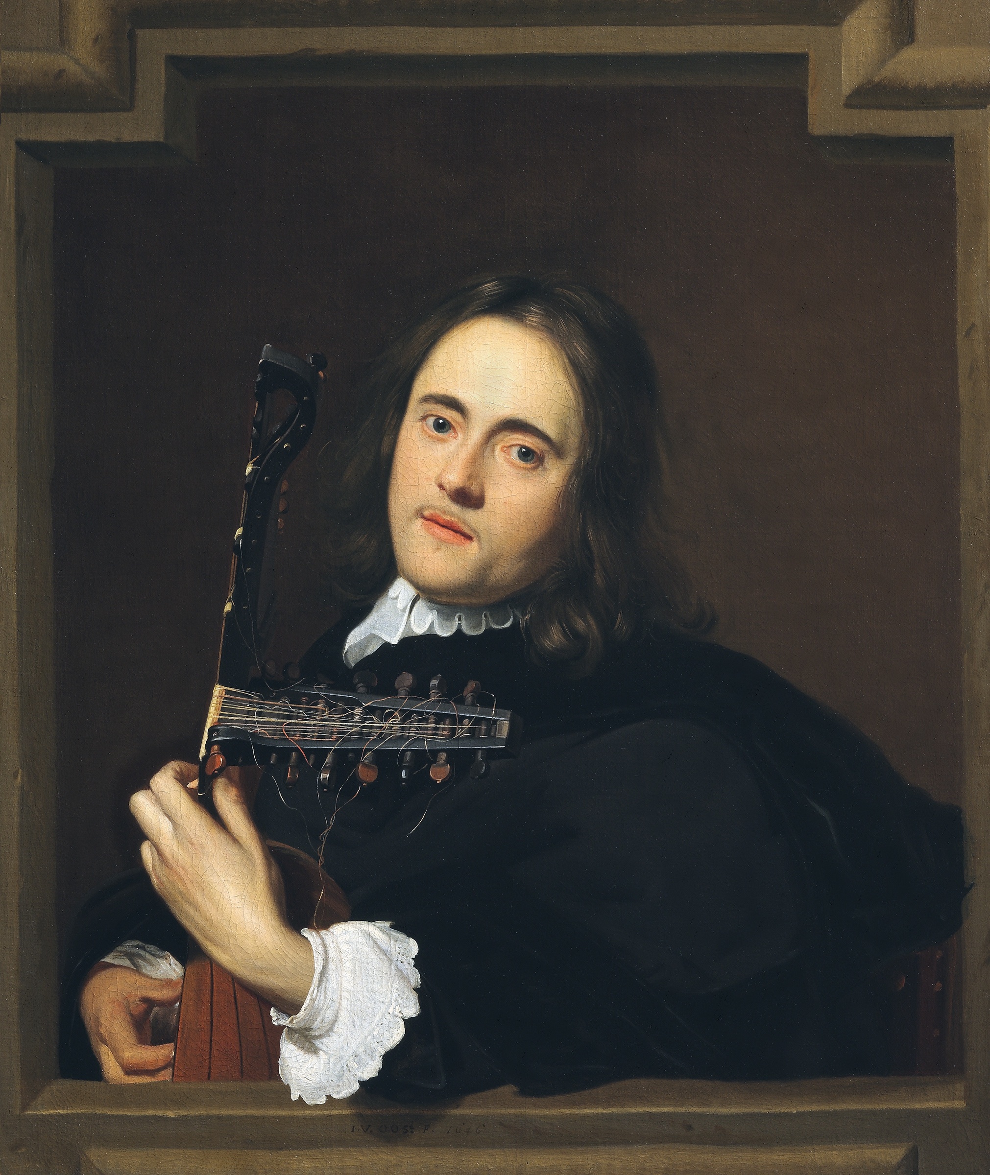 A young man with shoulder length hair appears half length in a stone window. He turns to the viewer’s left, and meets our gaze. His cape is dark green and his white lace collar and cuffs have a scalloped design. He plays a theorbo, a popular seventeenth century lute featuring two sets of strings and pegs, one above and somewhat to the side of the other. Mariagrazia Carlone identified it specifically as a 12-courses lute, which purportedly was invented by Jacques Gauthier about 1630 and enjoyed widespread popularity in the Low Countries. The man stands against a neutral dark background. The whole composition is framed by a gray architectural surround, on the bottom of which the man rests his left arm. His features are sufficiently individualized to suggest a portrait.
