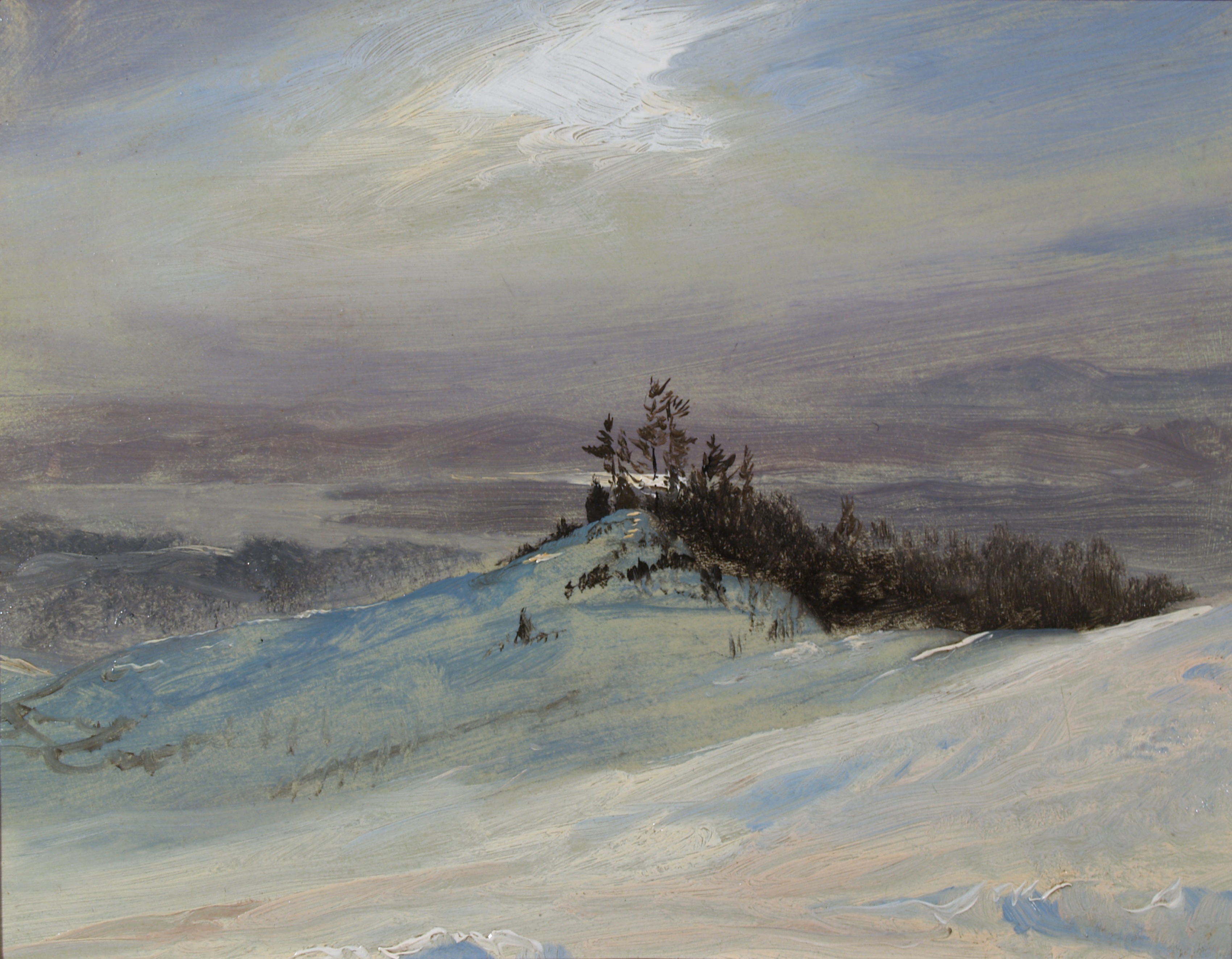 This winter sketch resembles an undated oil still at Olana which Church framed for display, and another oil, dated 1871, now in a private collection. The tree-crowned eminence in the foreground is Quarry Hill. This smaller, freely brushed work suggests unsettled weather. By the 1890s, the last decade of his life, Church had decorated the interiors of Olana with at least fifteen small oils and one medium-size canvas of views of Olana.