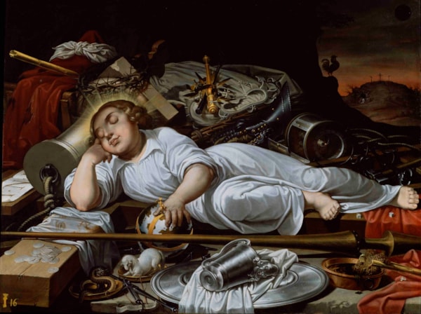 The Colonna inventory mark in the lower left corner suggests that the Sleeping Christ Child was painted in Rome. There is a pagan quality reminiscent of depictions of Eros, the god of love, as a pudgy winged baby. Perhaps the artist saw a Hellenistic bronze of this subject or Caravaggio’s Sleeping Cupid.