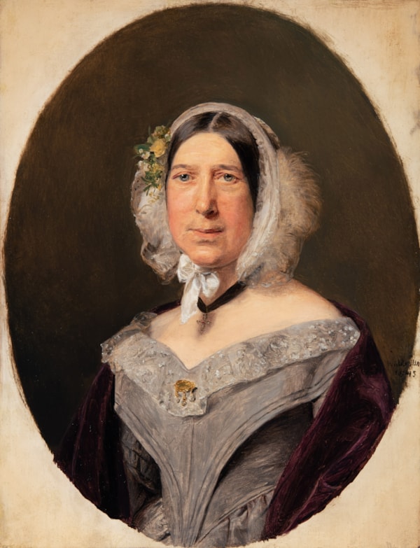 It seems likely that Frau Professor Hürtel came from the same professional class as the artist, suggesting a personal connection. The careful modelling of her flesh and rendering of her clothes betray the hand of a miniature painter who succeeds in bestowing inner greatness on a small scale. Her heavily lidded, dotted eyes do not seek the viewer but are lowered in introspection. Her plain features are set off by a diaphanous bonnet tied below the chin and embellished with a posy of yellow flowers. The subdued colors continue in the gray dress, purple shawl, and neutral background.